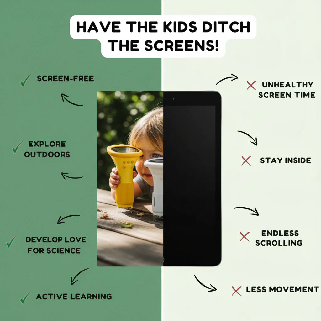 Apps add screen time and feel passive. Traditional scopes are fragile/indoor-only. Buggy Lens is portable, durable, and made for real-world discovery.